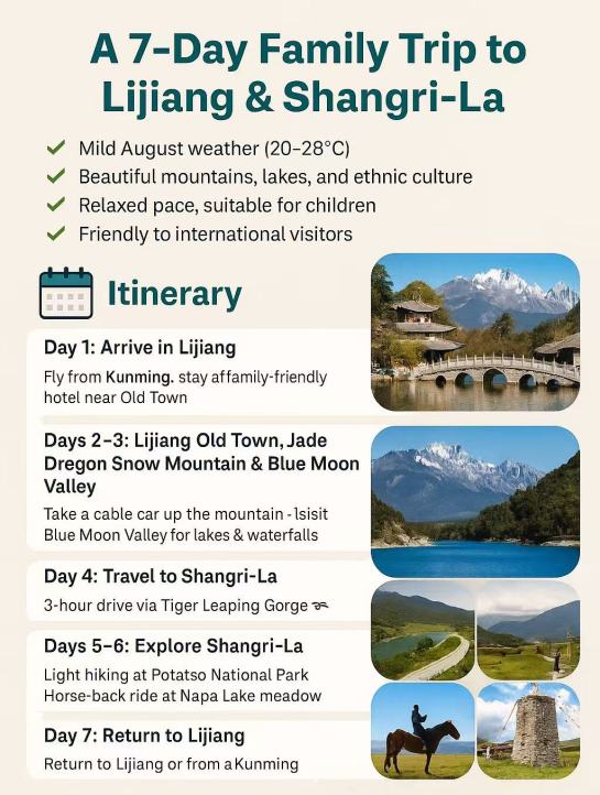 β Why This Trip is Great: Mild August weather (20°C–28°C), much cooler than cities in Eastern China Beautiful scenery: highland lakes, snowy mountains, old towns,...